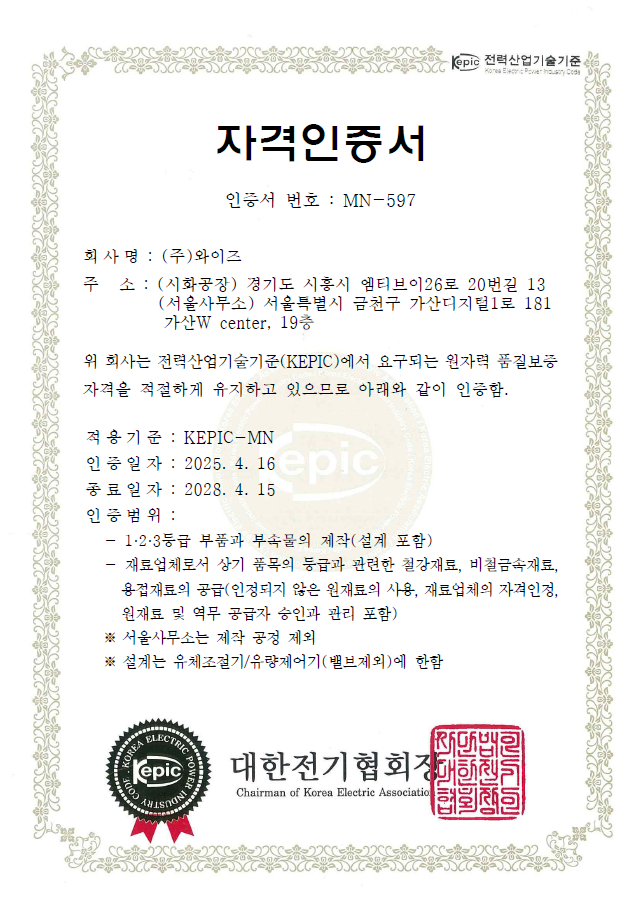주식회사 와이즈(이하 '당사'라 함)는 당사에서 제공하는 품목의 안전성과 신뢰성을 보증하고, 고객의 요구사항을 충족시키기 위해 우수한 인력을 확보, 유지함과 아울러, 전력기술기준(KEPIC)을 비롯한 원자력 제반규정, 규칙 및 표준의 취지를 준수하는 품질보증계획을 수립, 이행함으로서 당사가 공급하는 품목의 품질을 달성, 보증하는 데 최선을 다하고자 당사의 품질목표 및 품질방침을 다음과 같이 정하고 실행한다.